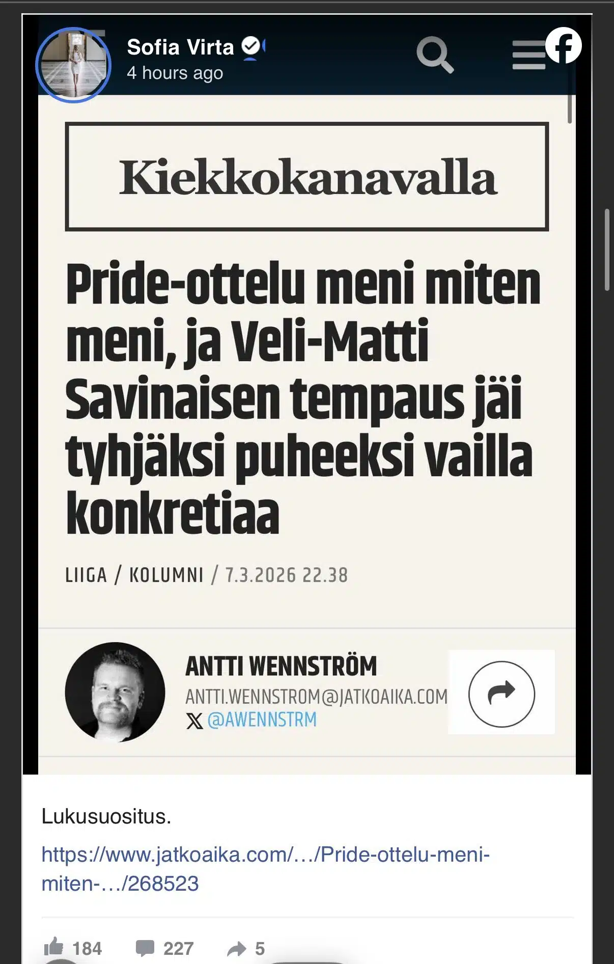 Virta ajautui kohun keskelle suositeltuaan Facebookissa jääkiekkosivusto Jatkoaika.comin kolumnia, jossa kritisoitiin Savinaista Pride-kohun yhteydessä.