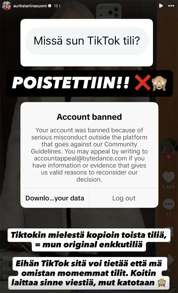 Kananen avasi tilannetta jakamalla kuvakaappauksen Tiktokin ilmoituksesta. Sen mukaan tili on estetty vakavan väärinkäytöksen vuoksi, koska se rikkoo palvelun yhteisön suuntaviivoja. Ilmoituksessa neuvotaan ottamaan yhteyttä sähköpostitse, mikäli päätös on virheellinen.
