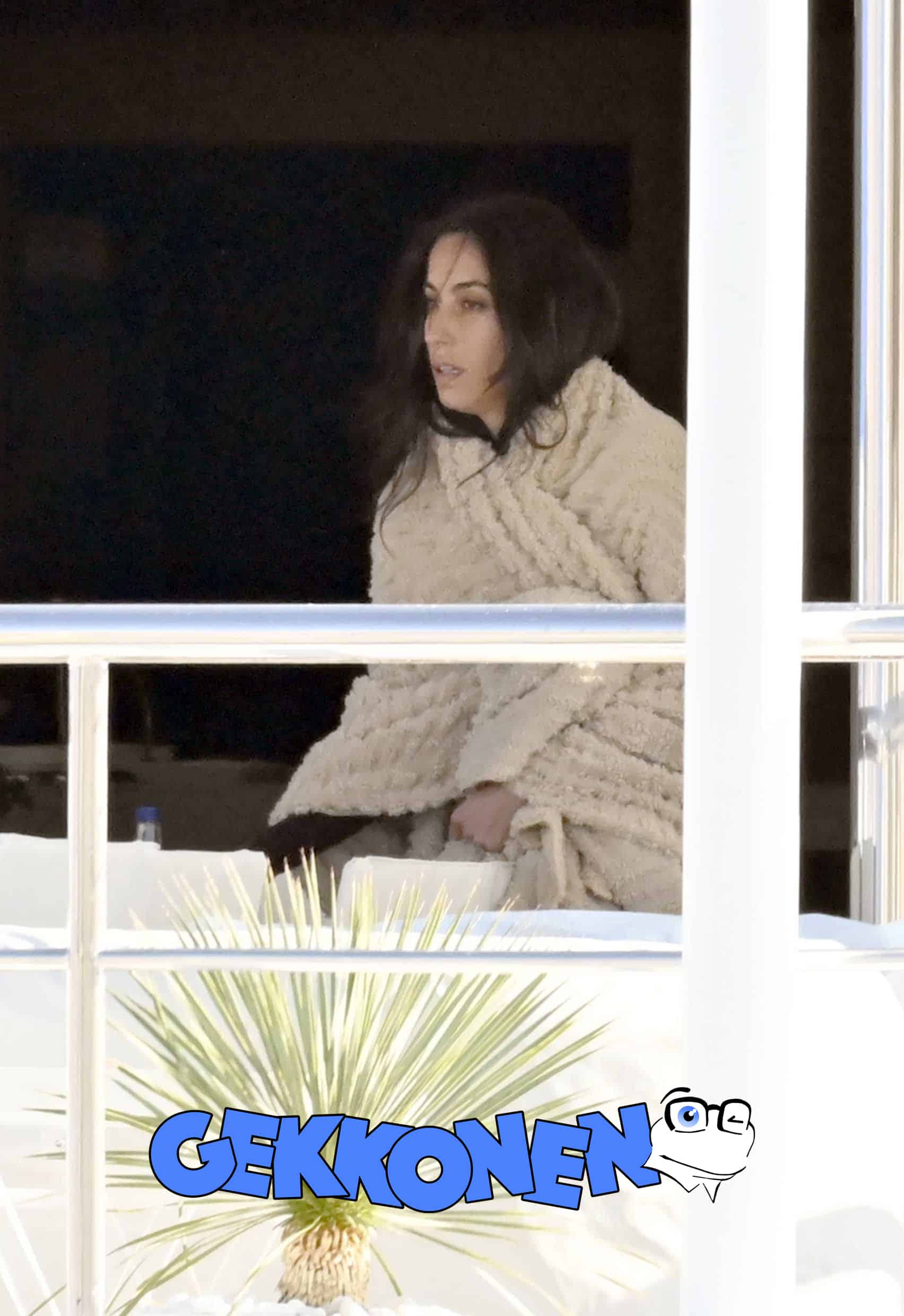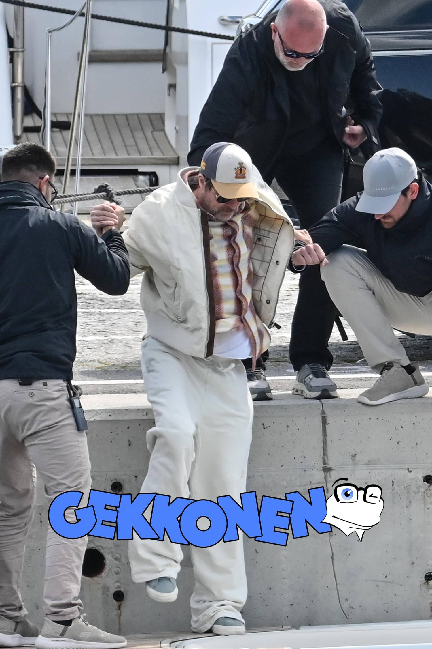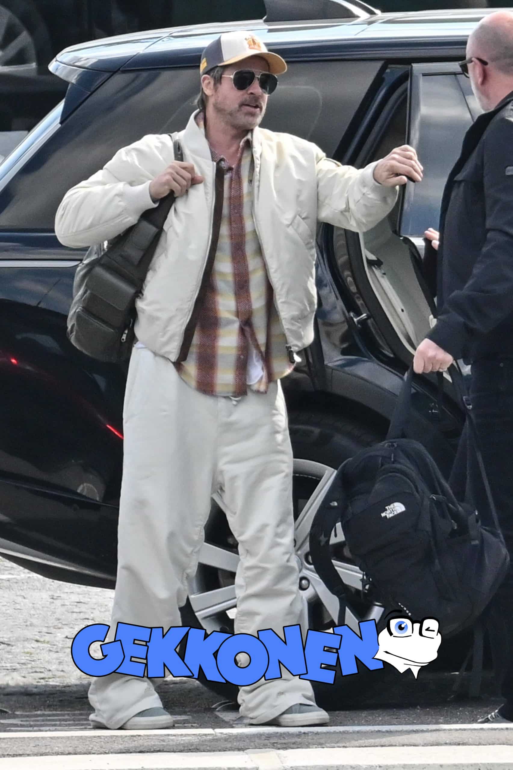 Paparazzikuvissa näyttelijällä on yllään vaalea takki ja housut, ruutukuosinen paita sekä lippalakki ja aurinkolasit. Olallaan hän kantaa laukkua.