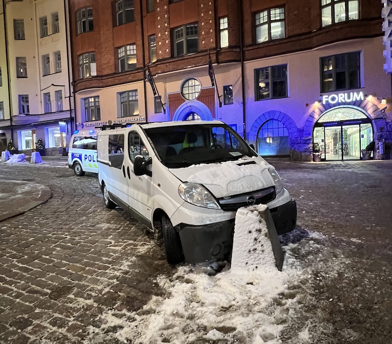 Helsingin Yrjönkadulla, kauppakeskus Forumin sisäänkäynnin edessä, sattui tiistai-iltana noin kello 19.00 aikaan kolari, jossa valkoinen Opel-merkkinen pakettiauto liukui päin kivipaalua.