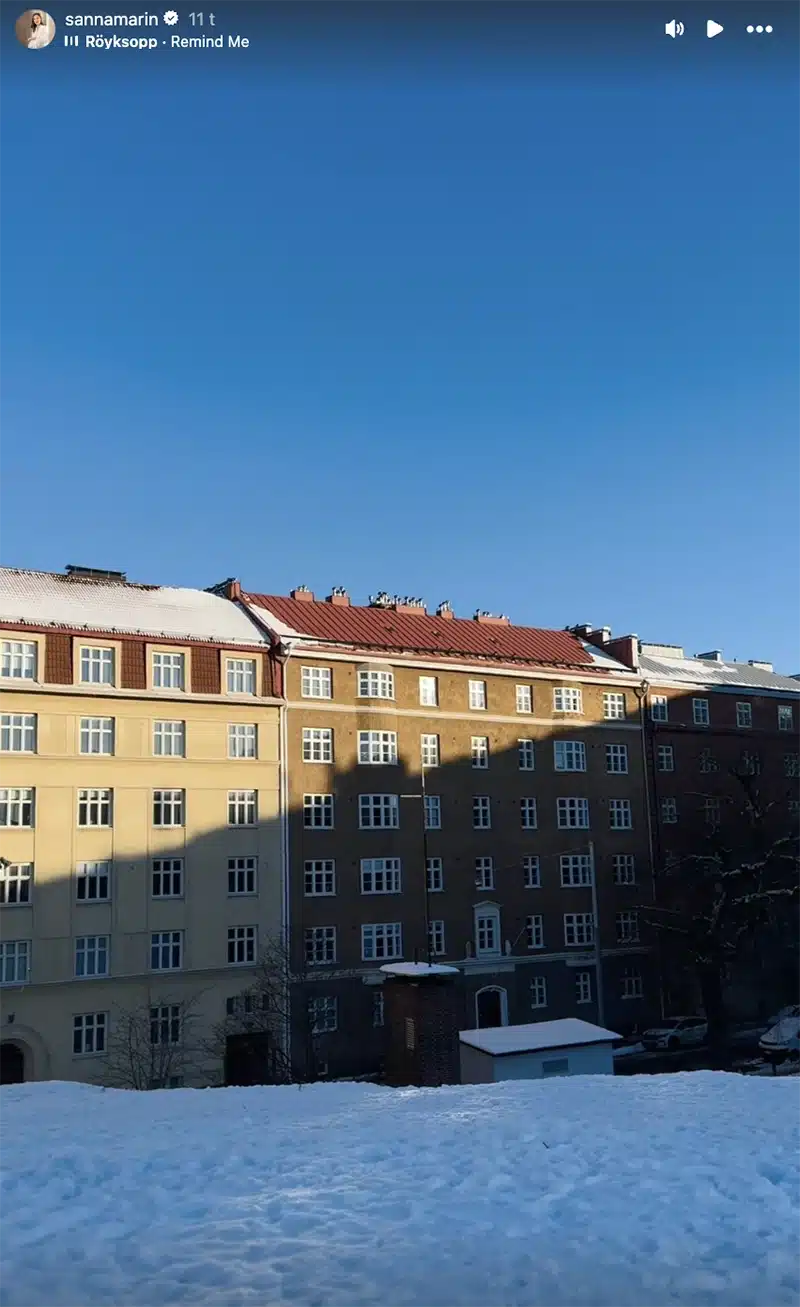 Marin julkaisi tämän jälkeen sometarinoissaan vielä videon talvisesta kaupunkimaisemasta, ilmeisesti Töölön kotikulmiltaan.