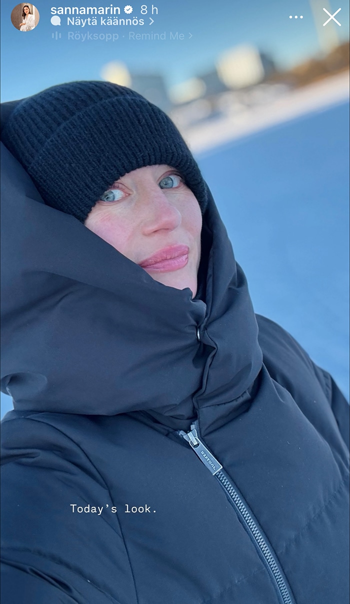 Marin julkaisi Instagram-tarinoissaan selfien, jossa hän poseeraa ulkona kääriytyneenä paksuun mustaan toppatakkiin ja pipoon niin, että kasvoista pilkistävät lähinnä silmät. Poskien sekä nenän punoitus kertoo, että pakkanen puree Sannaankin aivan samalla tavalla kuin tavalliseen duunariin.