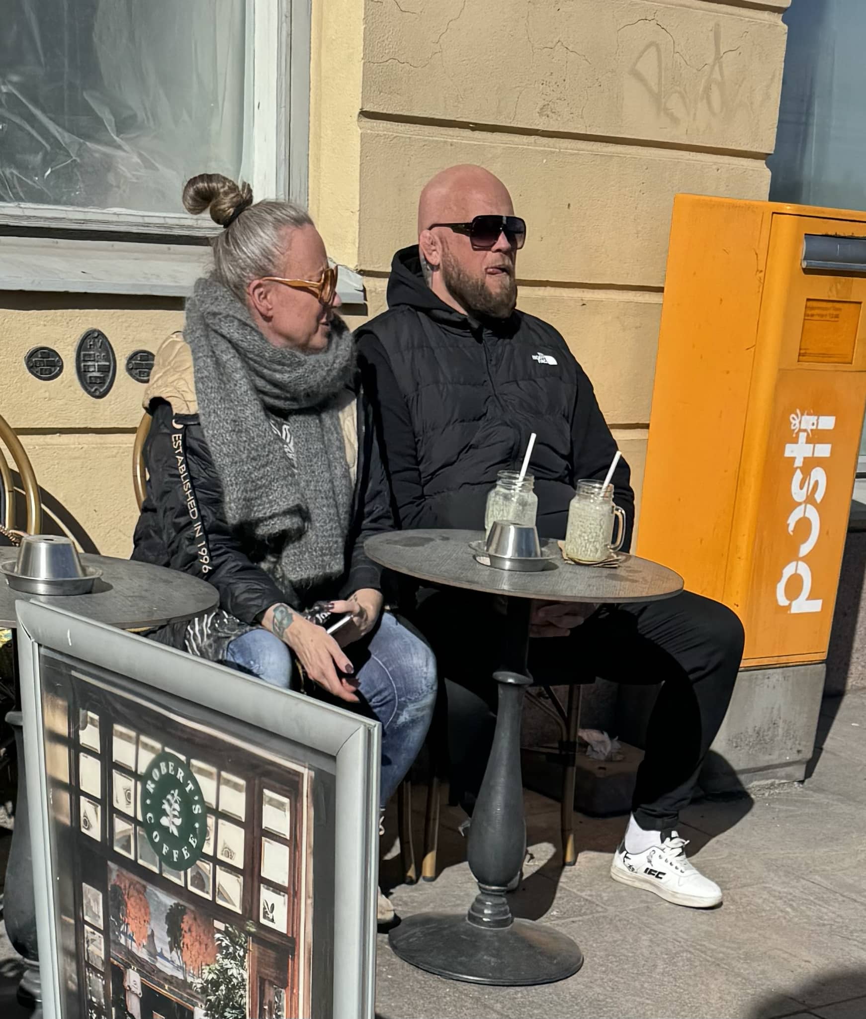 Immu ja Jonna paistattelivat päivää helsinkiläisen kahvilan terassilla.
