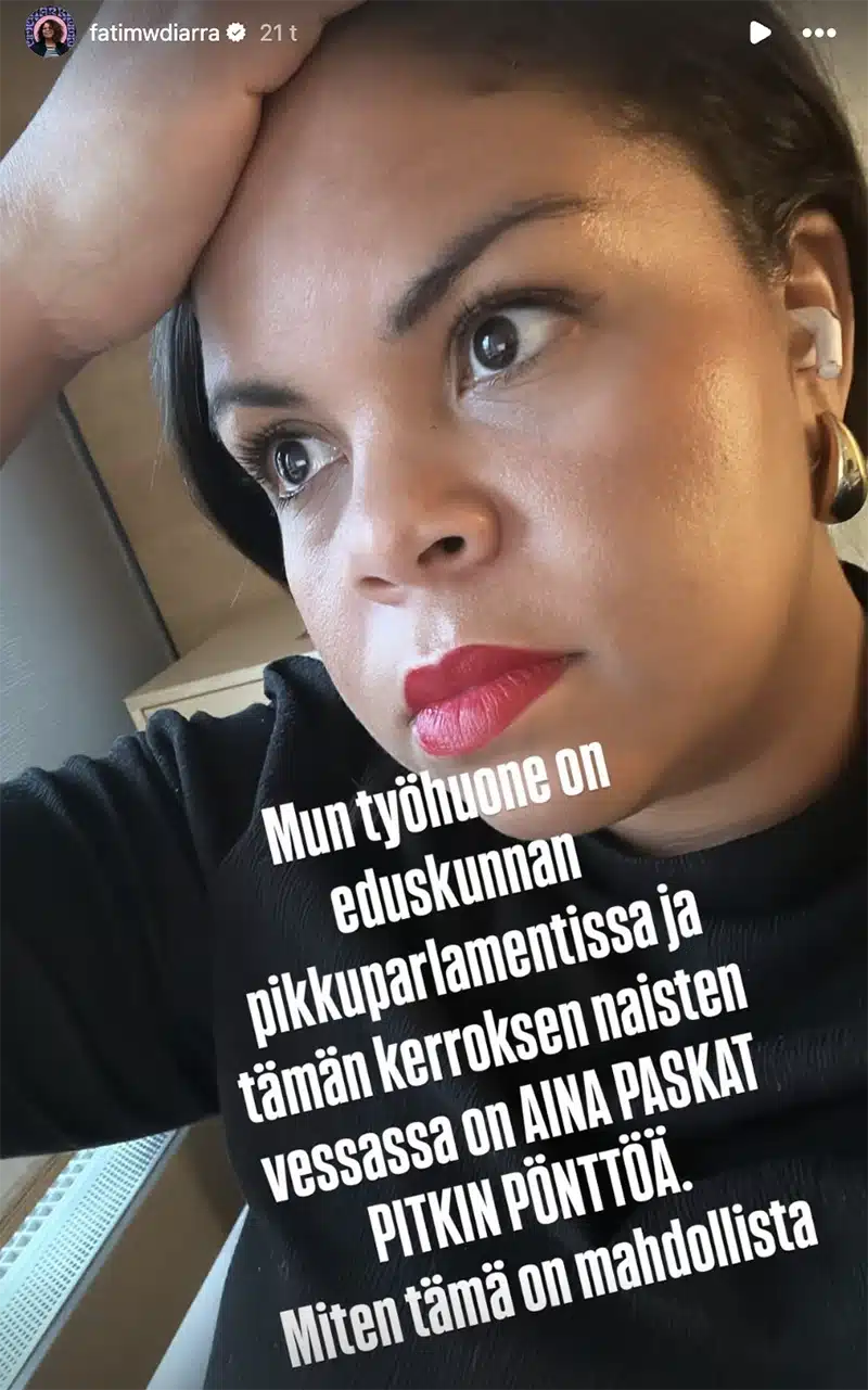 – Mun työhuone on eduskunnan Pikkuparlamentissa ja tämän kerroksen naisten vessassa on aina paskat pitkin pönttöä. Miten tämä on mahdollista? Diarra raivosi tiistai-iltana Instagramin tarinoissaan.