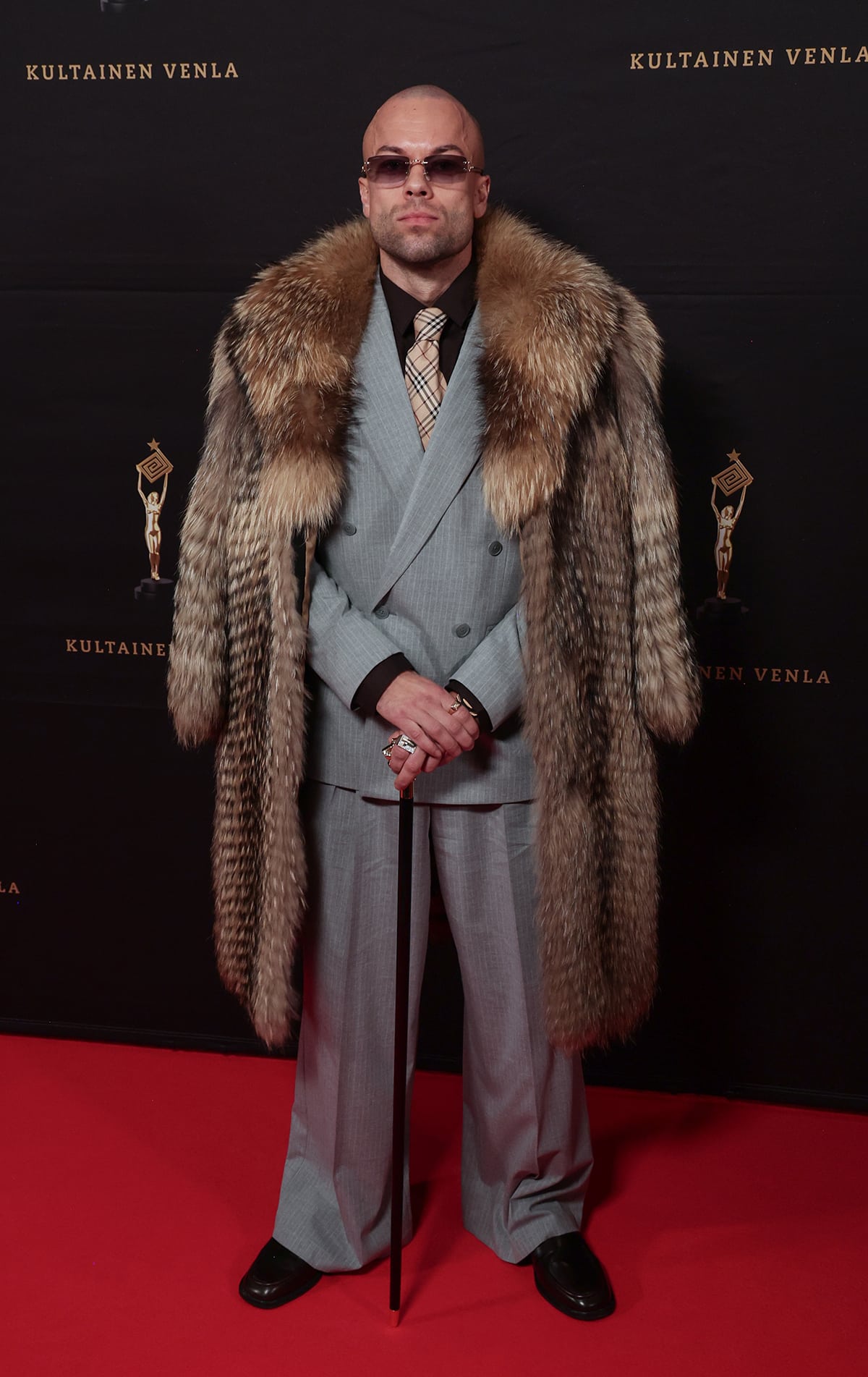 Kokonaisuus viimeisteltiin paksuilla sormuksilla ja kävelykepillä, joka ei ollut apuväline vaan vallan jatke. Petäistö patsasteli punaisella matolla kuin mafiapomo: