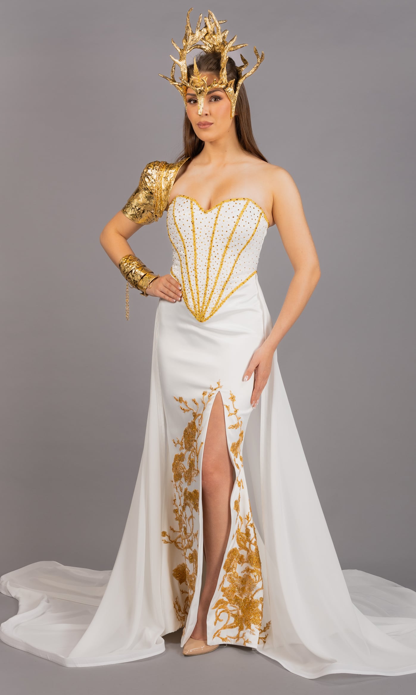– Goddess of the Living Roots -puku kuvastaa Suomea ja minua itseäni, rauhaa, luontoa ja sisäistä vahvuutta. Tämä asu kertoo, että todellinen kauneus kasvaa syvistä juurista. Puku muistuttaa, että todellinen vahvuus kasvaa juurista, jotka pitävät meidät yhteydessä toisiimme ja luontoon. Puku on sekä myyttinen että moderni, kunnianosoitus suomalaiselle sielunmaisemalle ja universaalille toivon ja rauhan sanomalle, Dzafce kertoo tiedotteessa.