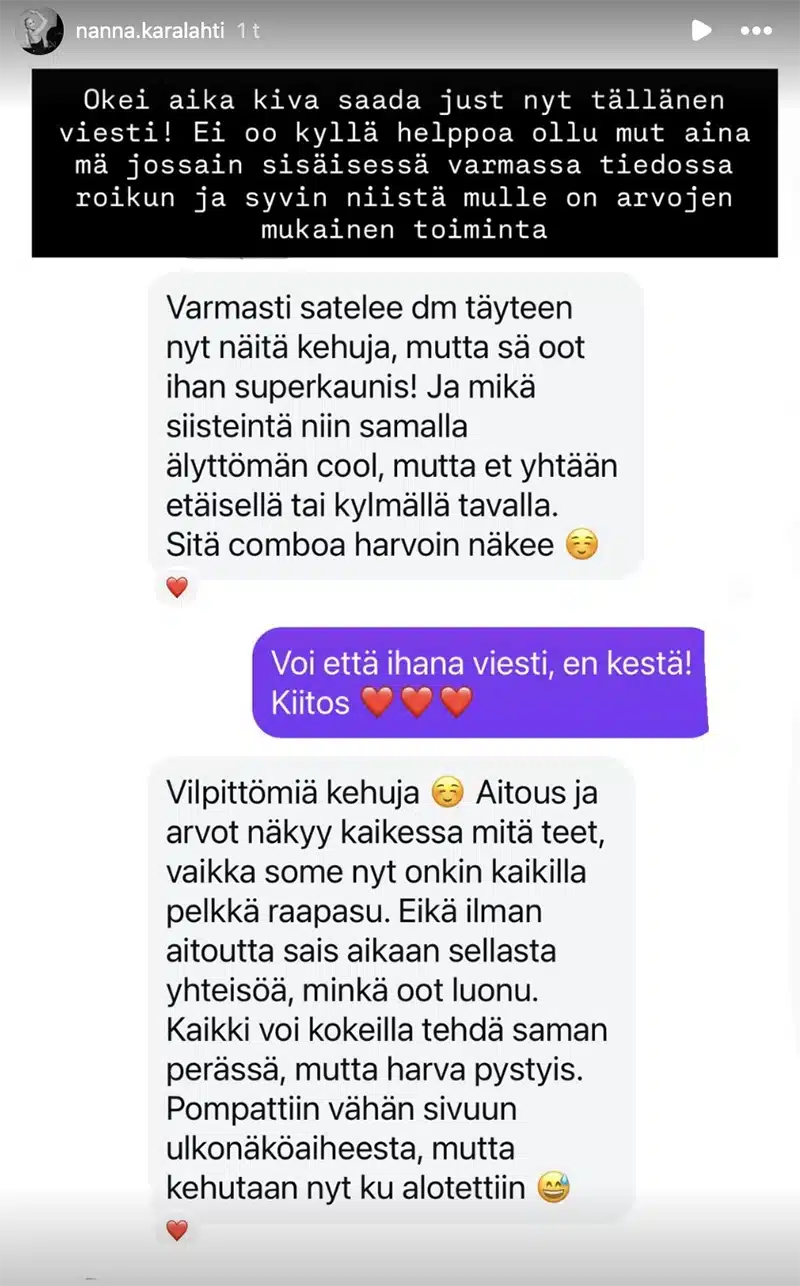 Samana päivänä, hieman kello 14 jälkeen, Nanna julkaisi Instagram-tarinoissaan seuraajalta saamansa viestin. Viestissä fanilta satelee kehuja Nannan luonteesta, aitoudesta ja kauneudesta.