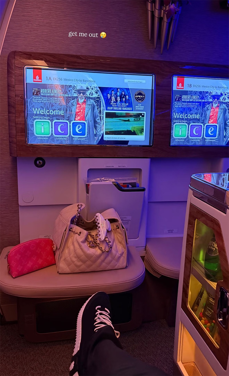 Sofia jakoi Instagram stoorissaan kuvan lentokoneesta lähtiessään Meksikosta ja kiteytti tunnelmansa napakasti: “Get me out”, eli päästäkää minut pois, surullisen emojin säestämänä.