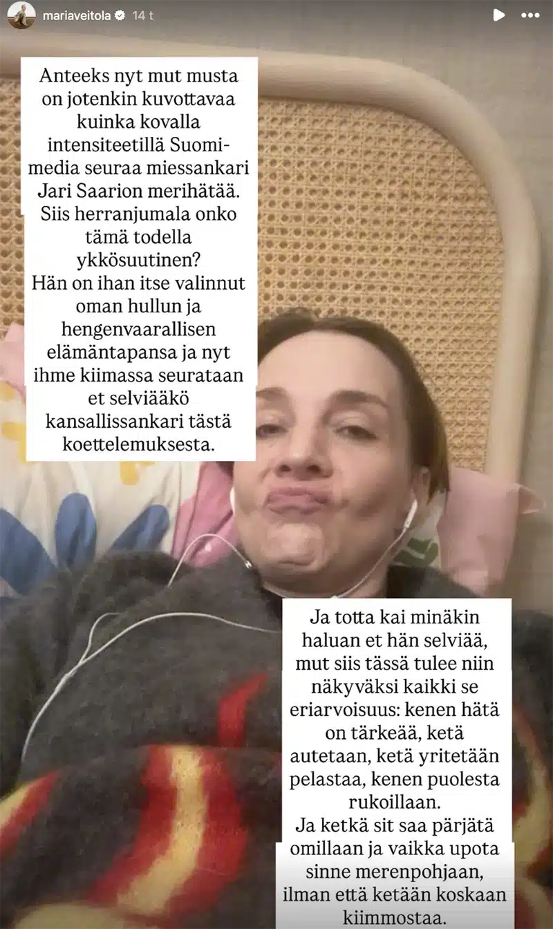 – Anteeksi nyt mutta minusta on jotenkin kuvottavaa, kuinka kovalla intensiteetillä Suomi-media seuraa miessankari Jari Saarion merihätää. Siis herranjumala, onko tämä todella ykkösuutinen? Veitola jyrähtää Instagram-tarinoissaan.