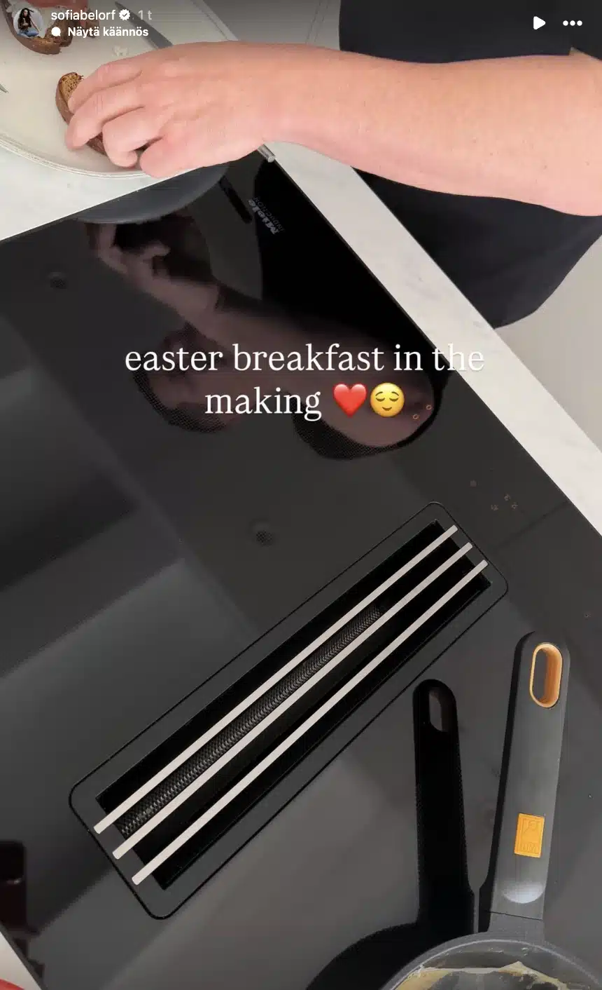 – Pääsiäisaamupala valmistuksessa, Sofia kirjoittaa julkaisemansa kuvan ohessa.