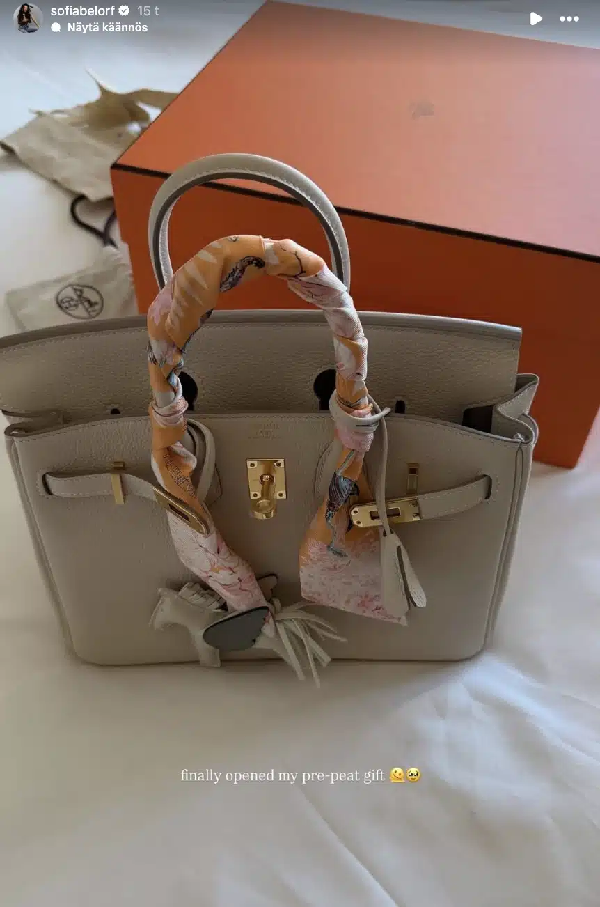 Belórf esitteli somessa myös saamaansa ”esisynttärilahjaa”, joka näyttää olevan uusi Hermès Birkin -ökylaukku.