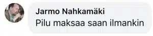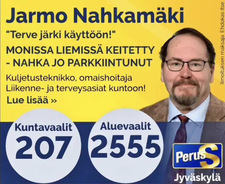 ”Pilu maksaa, saan ilmankin”, Jarmo Nahkamäki, entinen Perussuomalaisten paikallisyhdistyksen puheenjohtaja kirjoitti. Nahkamäki on puhunut mainoksesta.