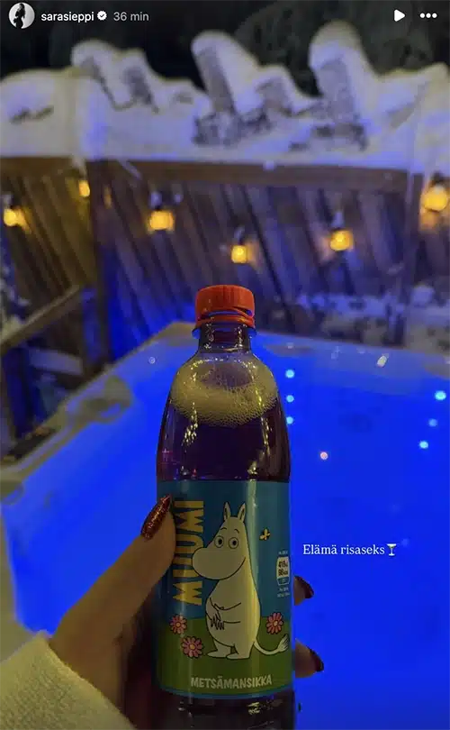 Tuoreissa Instagram tarinoissaan Sara Sieppi julkaisi kuvan, jossa hän kertoo laittavansa “elämänsä risaseksi”. Pilke silmäkulmassa tehdyssä otoksessa näkyy vain Saran käsi ja punainen Muumi-limsa, eikä alkoholia tietenkään ole mailla halmeilla, vaan päivitys on Siepille tyypillinen, hyväntuulisen itseironinen kommentti omaan “villiyteen”.