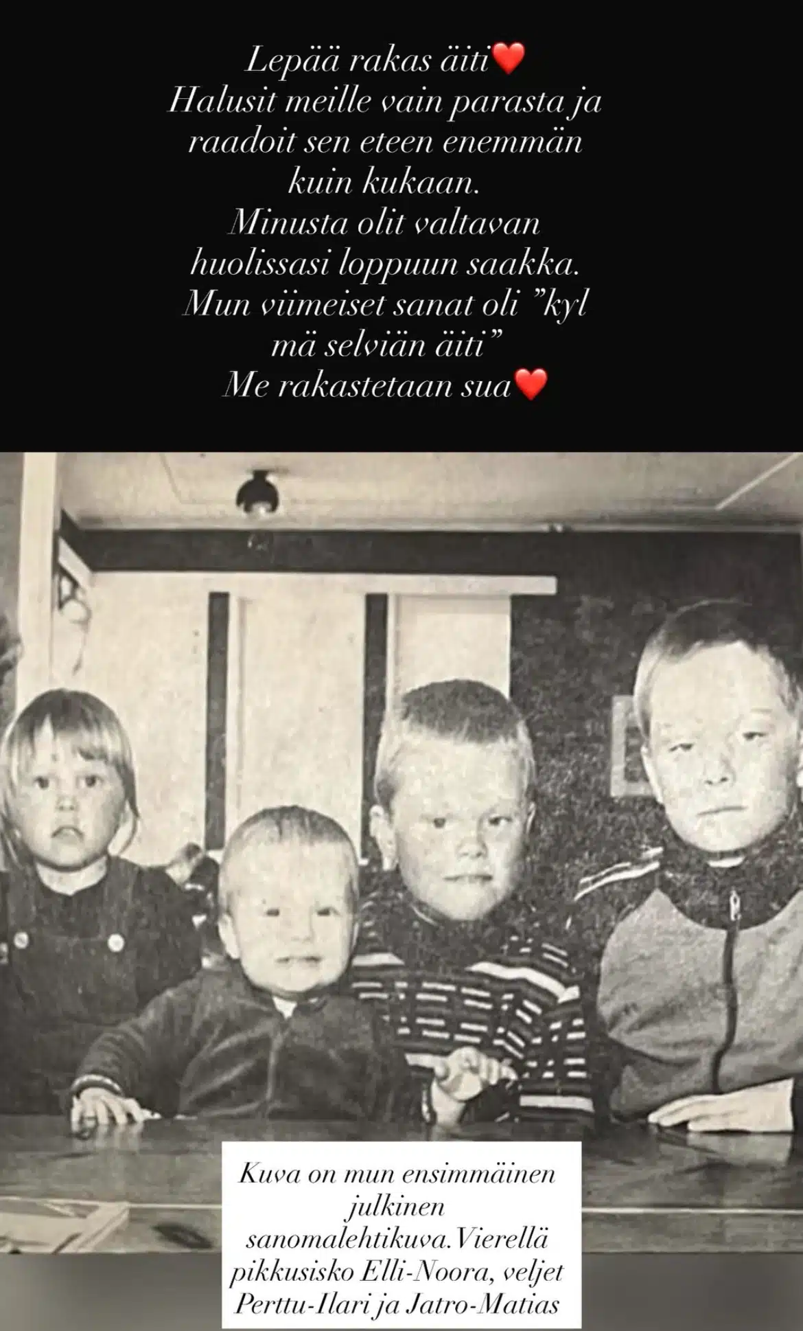 Palander on liittänyt päivitykseensä lapsuuskuvan, jossa hän poseeraa sisarustensa kanssa sanomalehtikuvassa.