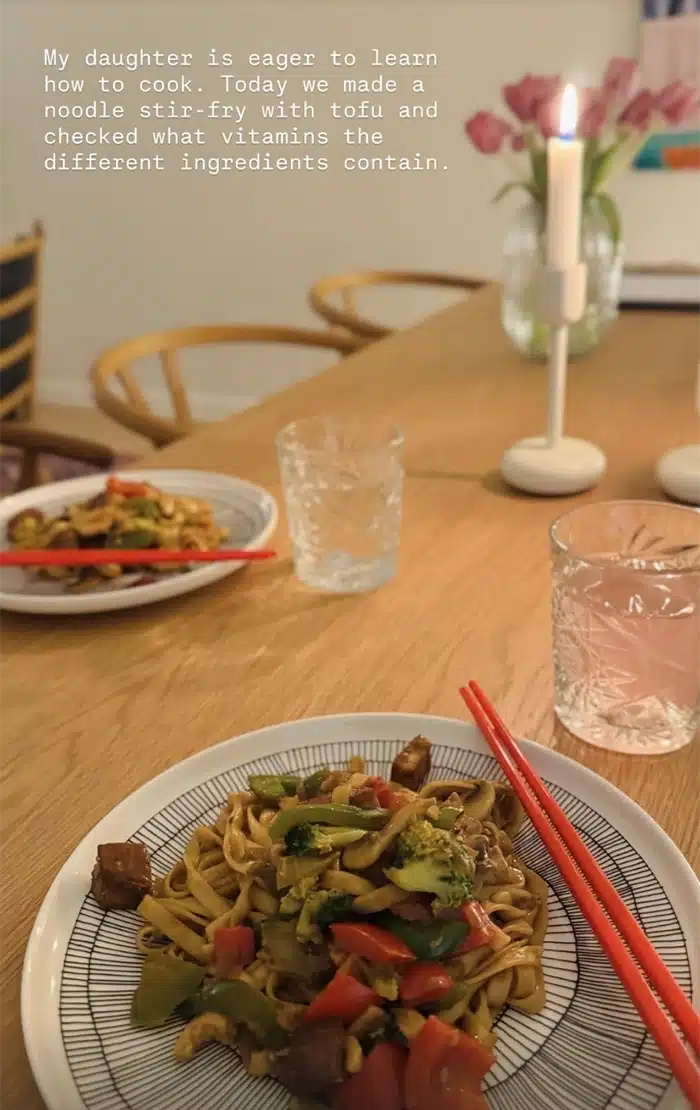 – Tyttäreni on innokas oppimaan ruoanlaittoa. Tänään teimme tofua sisältävän nuudelipannun ja selvitimme, mitä vitamiineja eri raaka-aineet sisältävät, Marin kirjoittaa kuvan yhteydessä englanniksi.