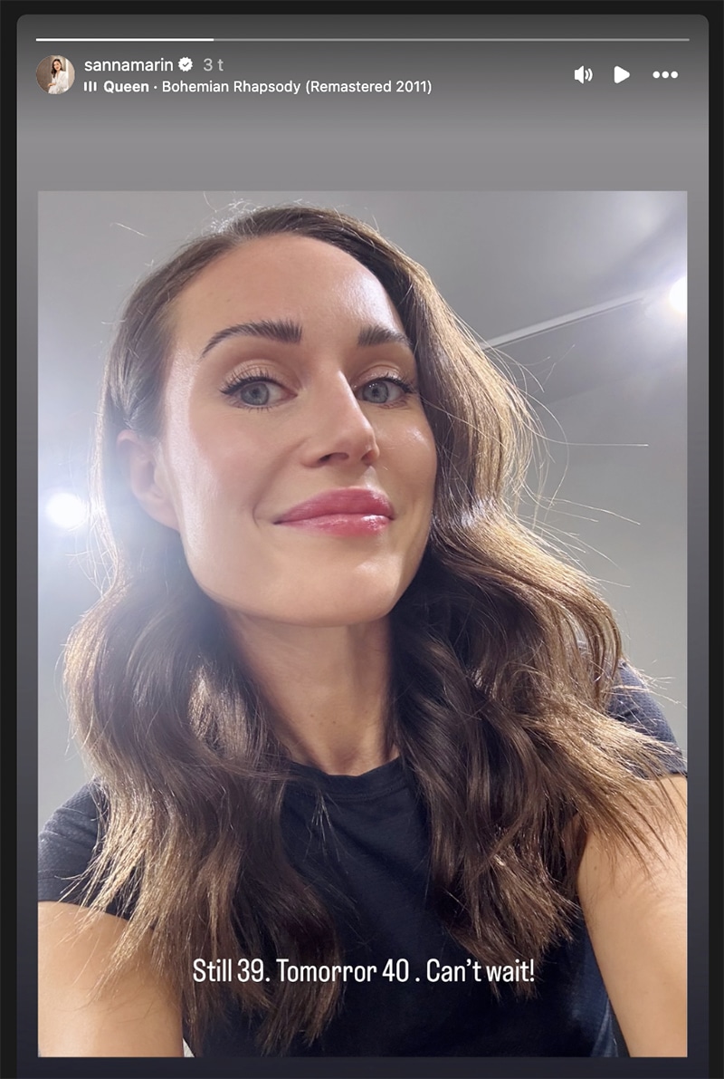 Ex-pääministeri Sanna Marin täyttää huomenna sunnuntaina (16.11.) pyöreitä eli 40 vuotta. Lauantai-iltana Sanna sujautti Instagram-stooreihinsa muikean selfien, joka olisi voinut olla suoraan L’Oréalin mainoksesta.
