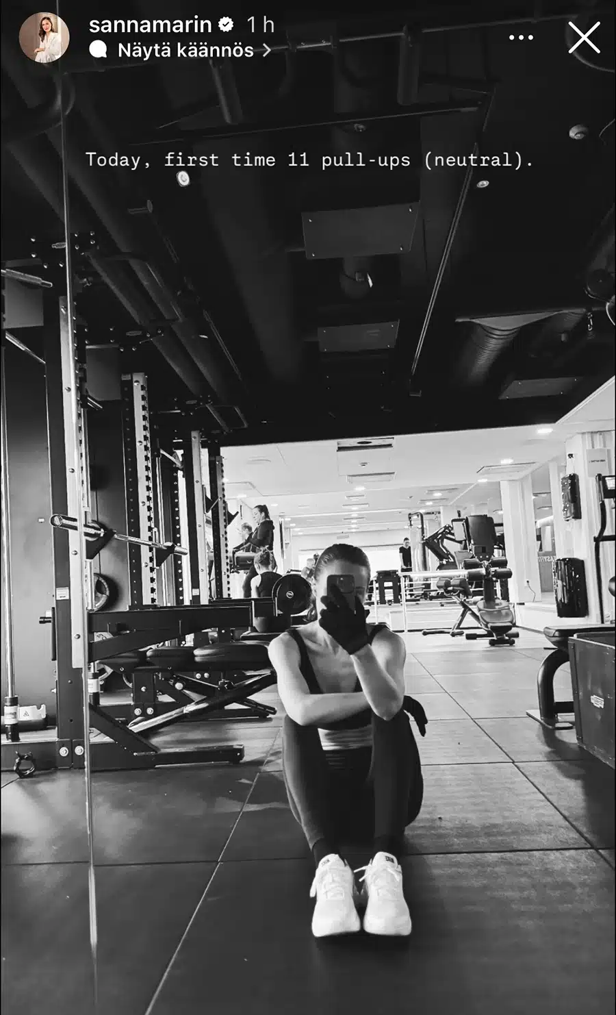 Mustavalkoisessa peiliselfiessä Marin istuu salin lattialla treenin jälkeen. Päivityksen yhteydessä hän paljastaa rikkoneensa itselleen uuden rajapyykin leuanvedoissa.