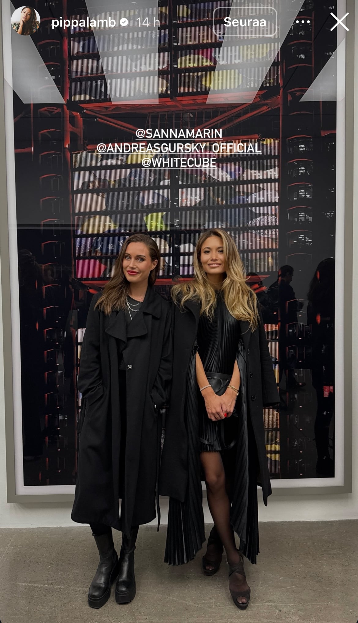 Marin jakoi tarinoissaan yhteiskuvan brittiläisen sijoittajan ja vaikuttajan Pippa Lambin kanssa, jonka kanssa hän vieraili näyttelyssä. Kuva oli alun perin Lambin julkaisema, ja Marin jakoi sen edelleen omiin stooreihinsa.