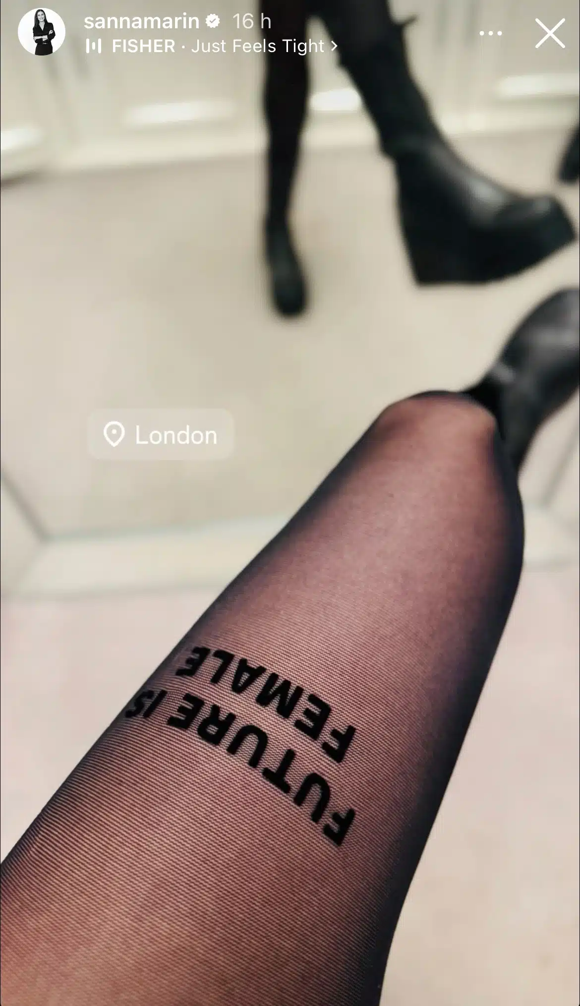 Lontoossa Marin innostui vilauttamaan lähempää myös sukkahousujensa rohkeaa sanomaa: ”Future is female”.