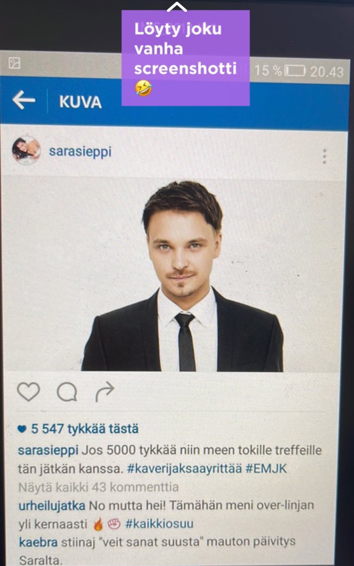 – Jos 5000 tykkää niin meen tokille treffeille tän jätkän kanssa, Sieppi kirjoitti tuolloin Instagramissa.