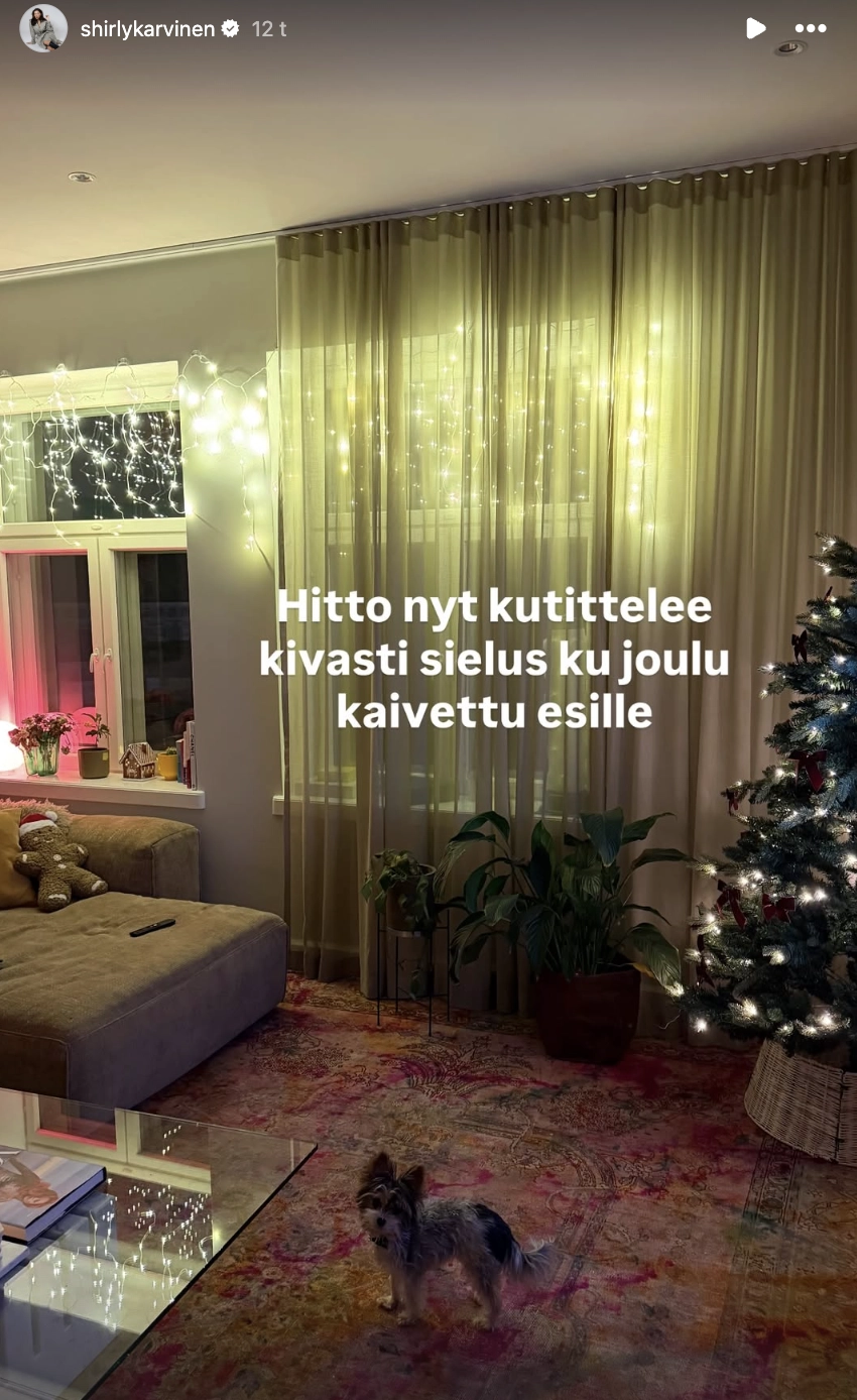Shirly Karvinen julisti joulun alkaneeksi – koti täynnä valoja, fiilistä ja hämmentynyt Pena-koira.