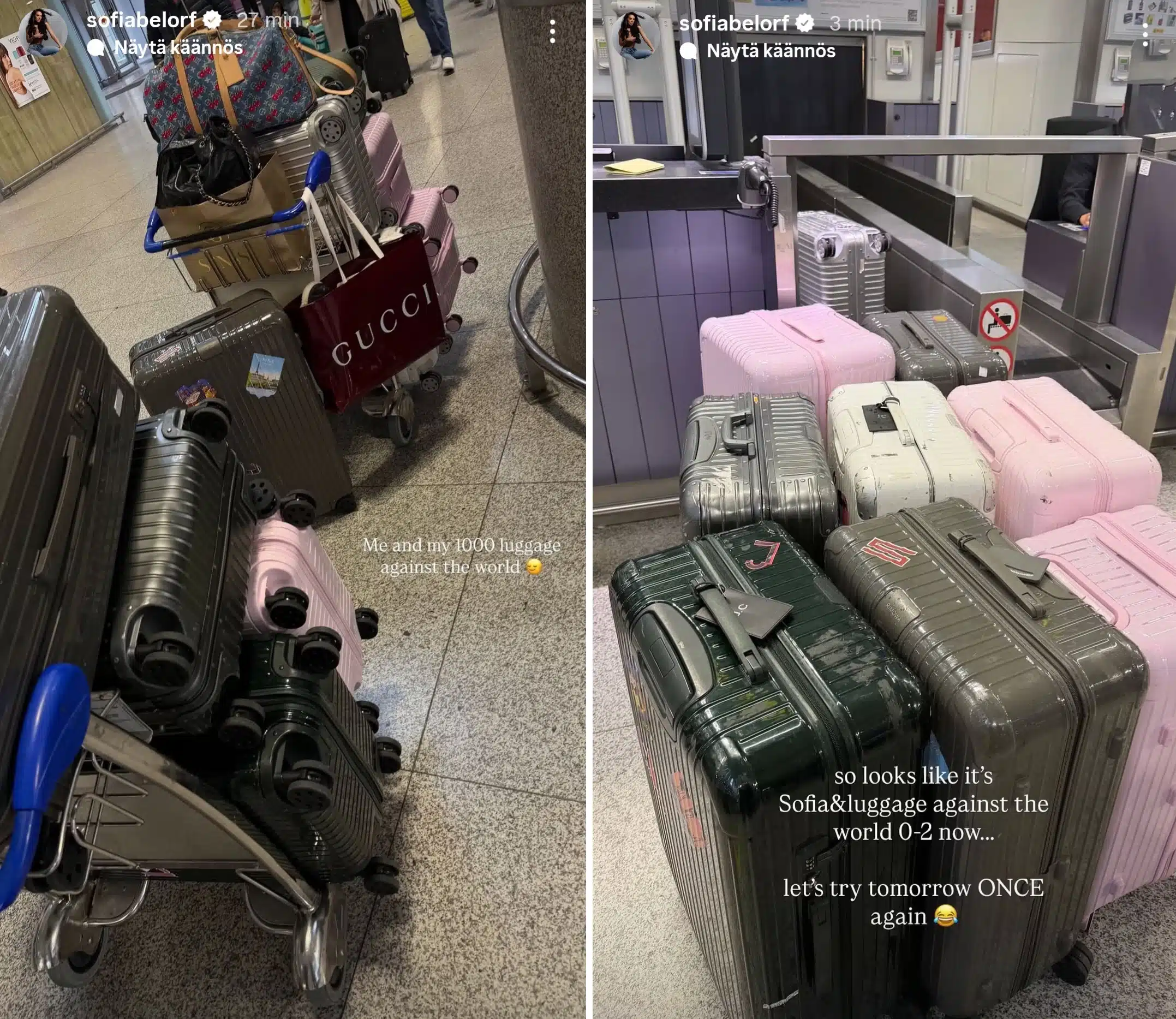 – Minä ja minun 1000 matkalaukkuani vastaan maailma, Belóf kirjoitti matkalaukkukuvan yhteydessä.