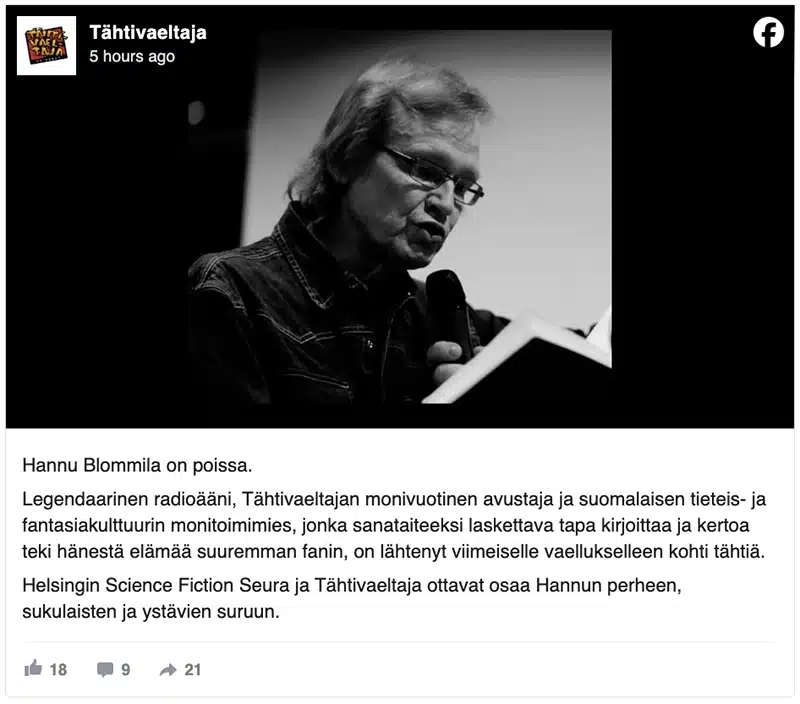 Tähtivaeltaja, Helsingin Science Fiction Seuran lehti, kertoi Blommilan poismenosta Facebookissa.