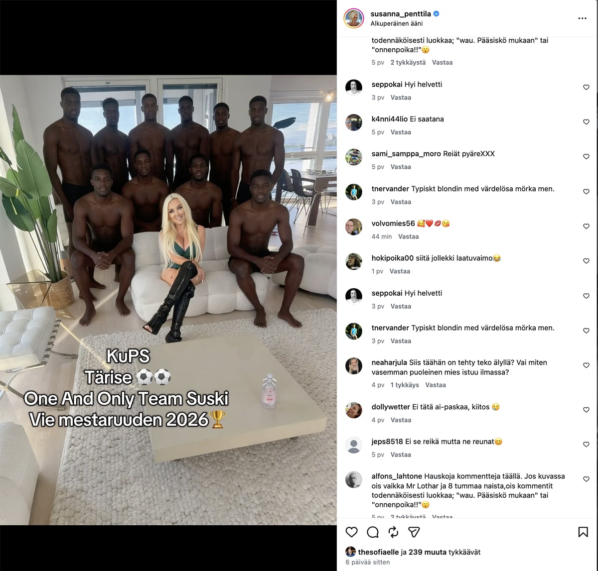 Suski markkinoi OF-sivujaan ahkerasti sosiaalisessa mediassa, ja viime aikoina hänen Instagram-julkaisunsa ovat saaneet monien seuraajien kulmakarvat kohoamaan. Penttilä nimittäin loihtii postauksiinsa tekoälyn avulla toistuvasti paidattomia mustia miehiä, joiden keskellä hän poseeraa rohkeissa alusasuissa.