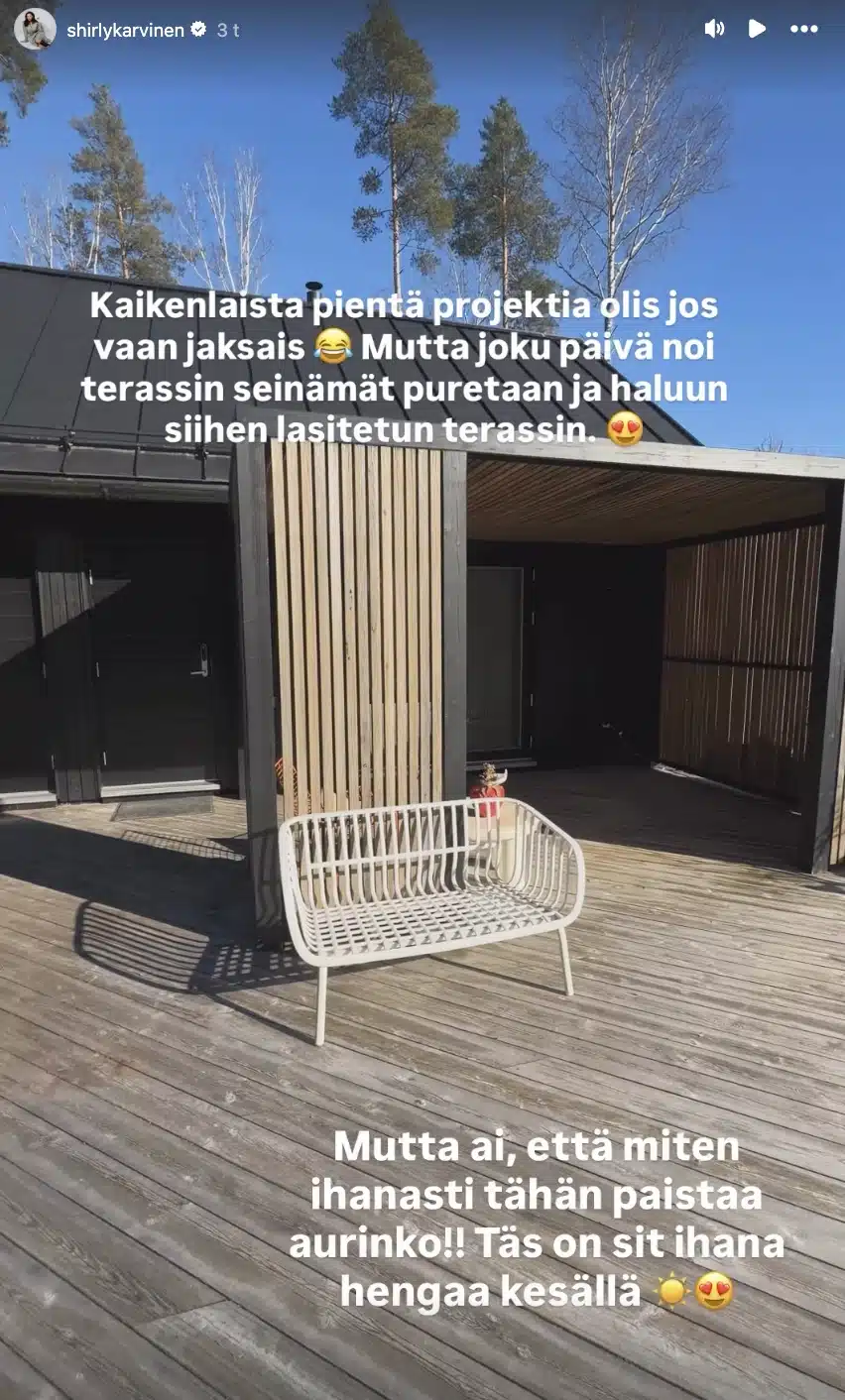Shirly esitteli suurta terassiaan, johon paistaa mukavasti aurinko. Kuva: Shirly Karvinen, Instagram