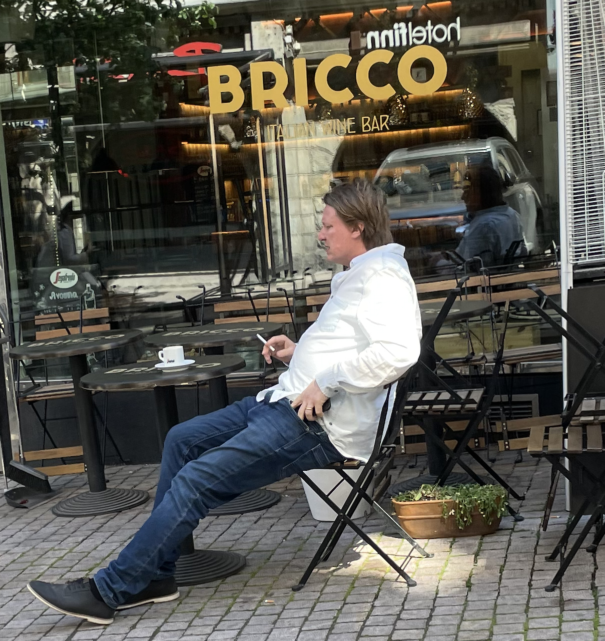 Tv-kasvo ja yrittäjä Jaajo Linnonmaa pisti tupakaksi ravintolansa terassilla viime kesänä.