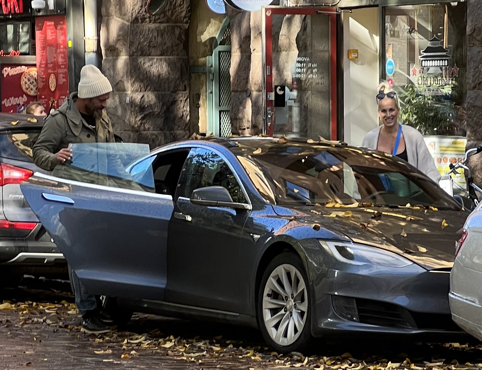 Ex-kiekkoilija Jere Karalahti ja Nanna-vaimo kuvattuna syyskuussa Teslansa kanssa.