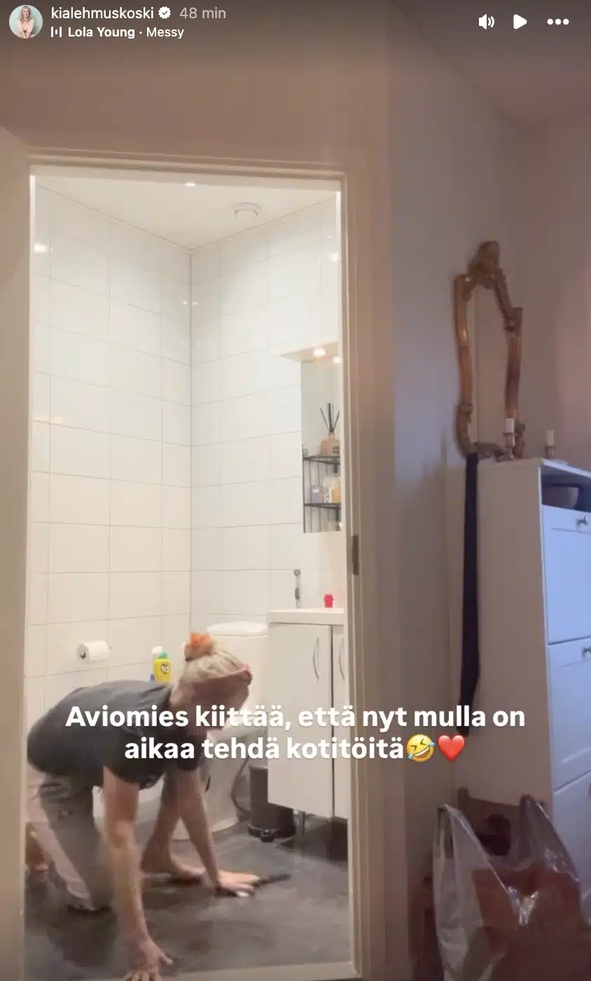 Lehmuskoski jakoi Instagram-stoorissaan videon, jossa hän siivoaa kovalla vimmalla kotinsa kylppäriä.