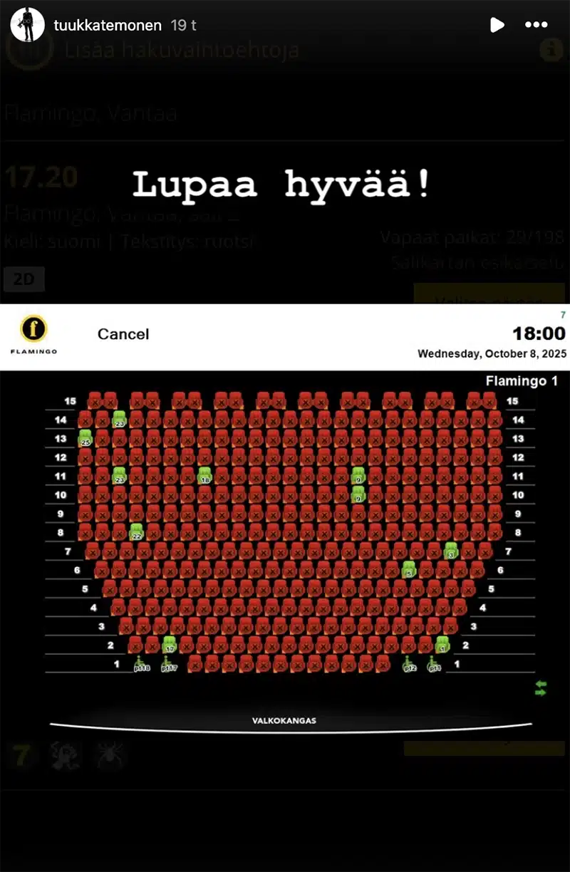 Nyt Tuukka on jakanut Instagram-tarinoissaan iloisia uutisia Cancel-elokuvasta: liput myyvät hyvin, ja elokuvateatterien penkit täyttyvät katsojista. Menestys näyttää lupaavalta, ja tunnelma on sen mukainen.