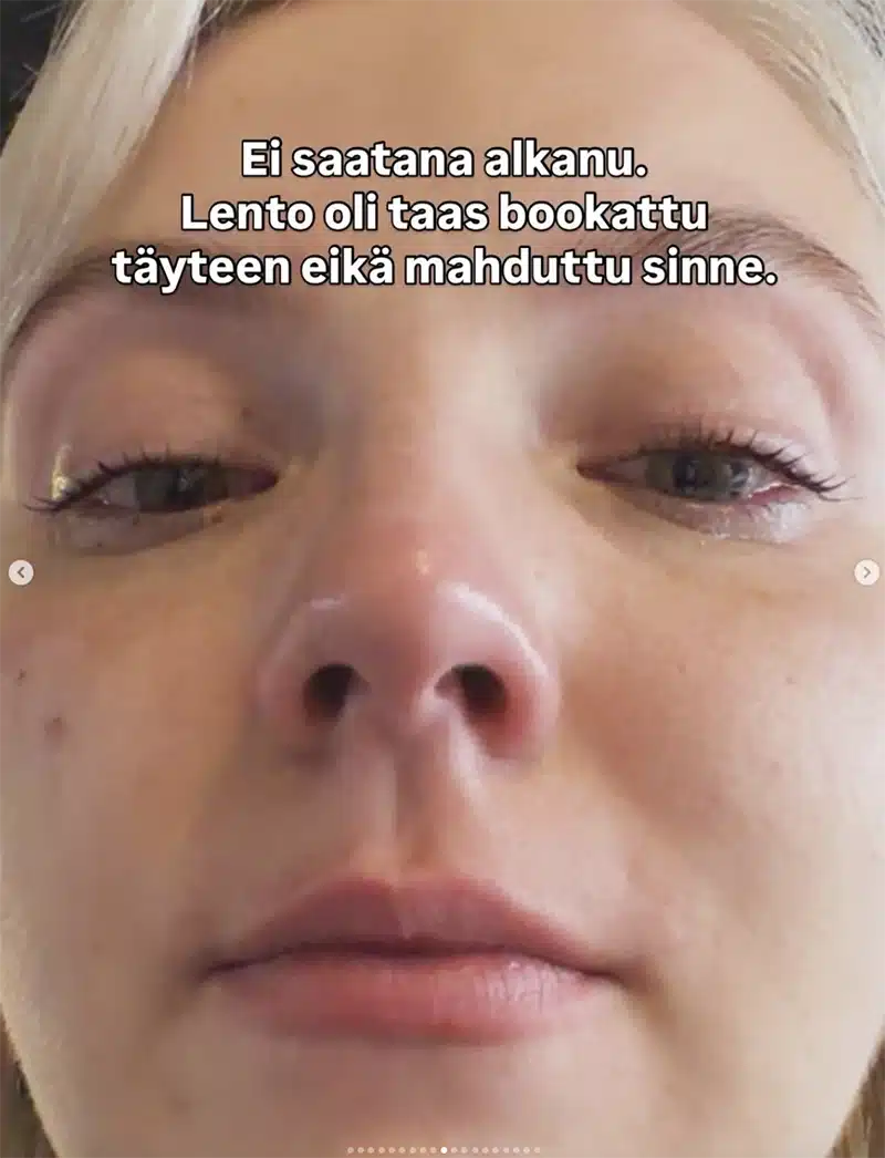 – Ei saatana alkanu. Lento oli taas bookattu täyteen, eikä mahduttu sinne, Verho kirjoittaa Instagramissa.