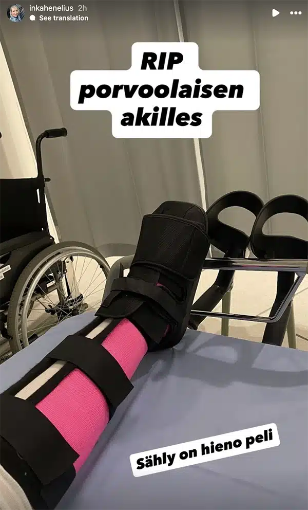 Myöhemmin Henelius päivitti tilanteestaan itse jakamalla kuvan Instagram-tarinoissaan sairaalavuoteelta. Jalassa oli jo tukeva paketti.